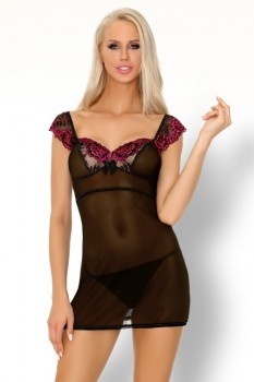 Komplet Kinge składa się z koszulki uszytej z czarnej mgły, ozdobionej różowymi kwiatami i stringów. Mgła to oczywiście cienka, jasnoszara siateczka, a kwiaty to różowo-czarna koronka z motywem róż. Motylkowe rękawki delikatnie otulają ramiona od góry.